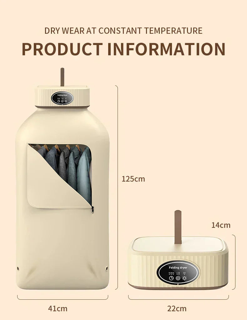 وداعًا لبطء التجفيف وكبر حجم الرفوف! شماعة تجفيف الملابس الكهربائية المحمولة هذه تستخدم حرارة خفيفة وتدفق هواء قوي لتجفيف الملابس بشكل أسرع وأكثر كفاءة. مثالية للأقمشة الرقيقة، والسفر، والشقق، والأيام الممطرة، فهي خفيفة الوزن وقابلة للطي، وتتناسب تمامًا مع خزانتك.
